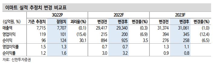 신한투자증권이 이마트에 대해 지난 2년간 실적이 부진했지만, 향후 온라인 사업의 적자 폭 축소 여부가 기업가치를 좌우할 것으로 전망했다. 투자의견은 ‘매수’ 유지, 목표주가는 12만 원으로 14% 하향조정했다.