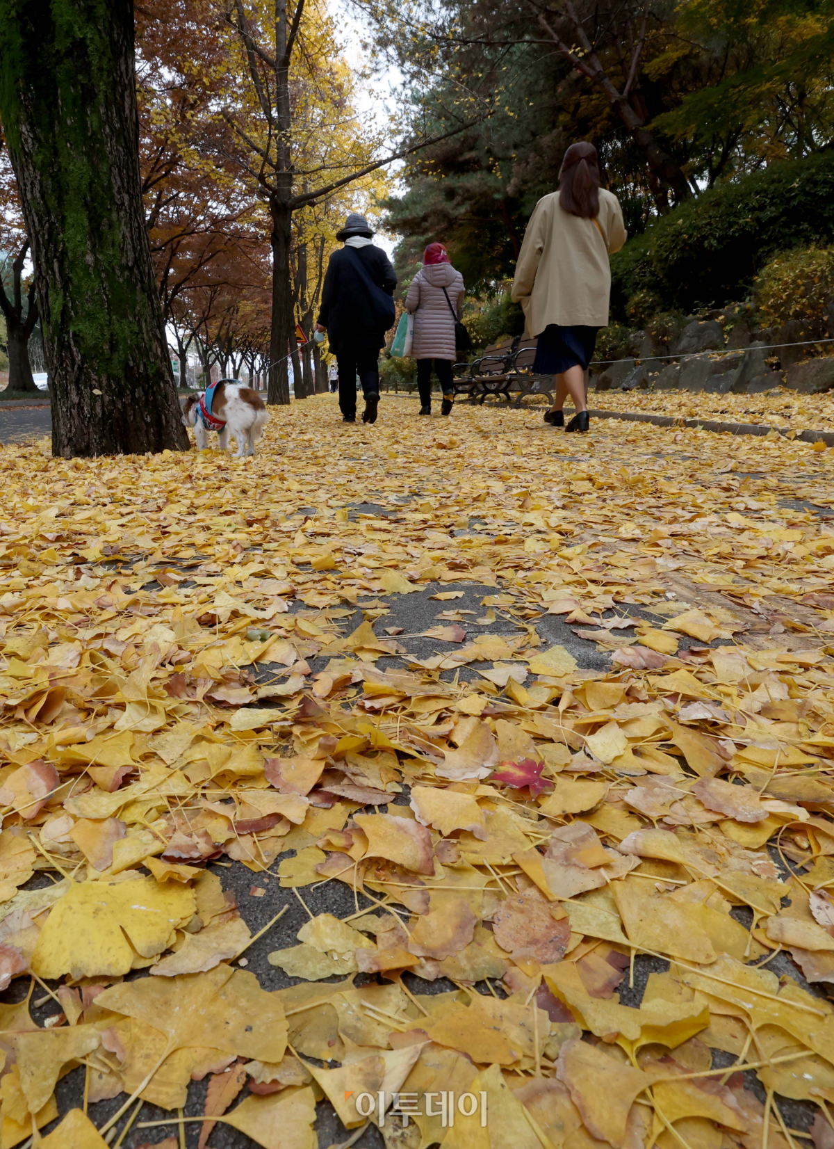 13일 서울 동작구 보라매공원 앞에 전날 내린 비로 낙엽이 떨어져 있다.