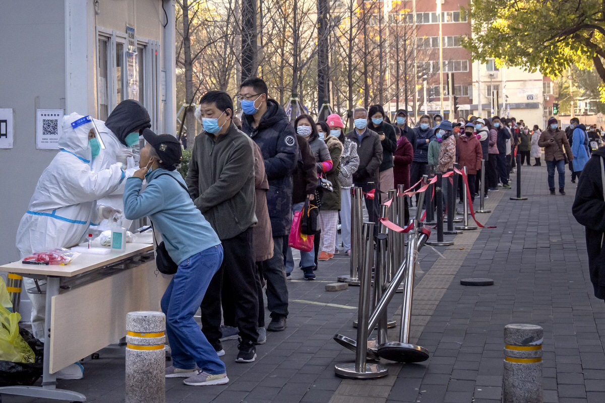 15일 중국 베이징의 한 임시검사소에서 시민이 신종 코로나바이러스 감염증(코로나19) 유전자증폭(PCR) 검사를 받기 위해 길게 줄을 서 있다. 중국 국가위생건강위원회가 발표한 전날 중국 본토 코로나19 신규 확진자는 1만7432명으로 4월 말 이후 6개월여 만에 최대치를 기록했다. 베이징(중국)/AP연합뉴스