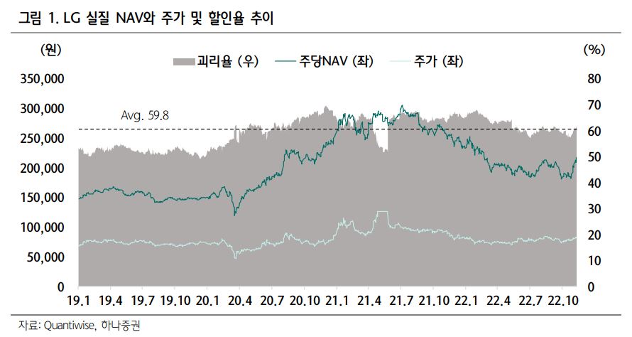 최 연구원은 “다만 LG CNS, 디앤오 등 비상장 자회사들의 실적 개선세는 지속 중”이라며 “최근 LG화학과 LG전자의 주가 상승으로 LG의 상장 자회사 지분가치가 급등한 반면 LG 주가 상승률은 미미해 실질 순자산가치(NAV) 대비 할인율은 더욱 크게 확대되고 있는 상황”이라고 분석했다.