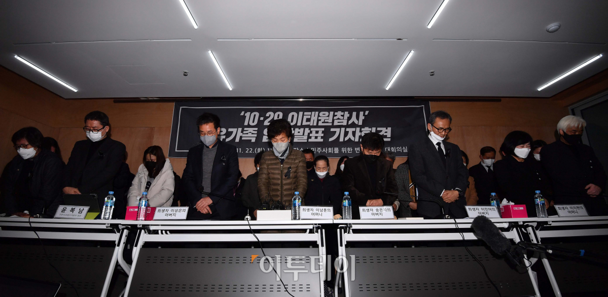 '이태원 참사' 유가족들이 22일 오전 서울 서초구 민주사회를 위한 변호사모임 대회의실에서 열린 '10·29 이태원 참사 유가족 입장발표 기자회견'에서 희생자들을 위해 묵념하고 있다.