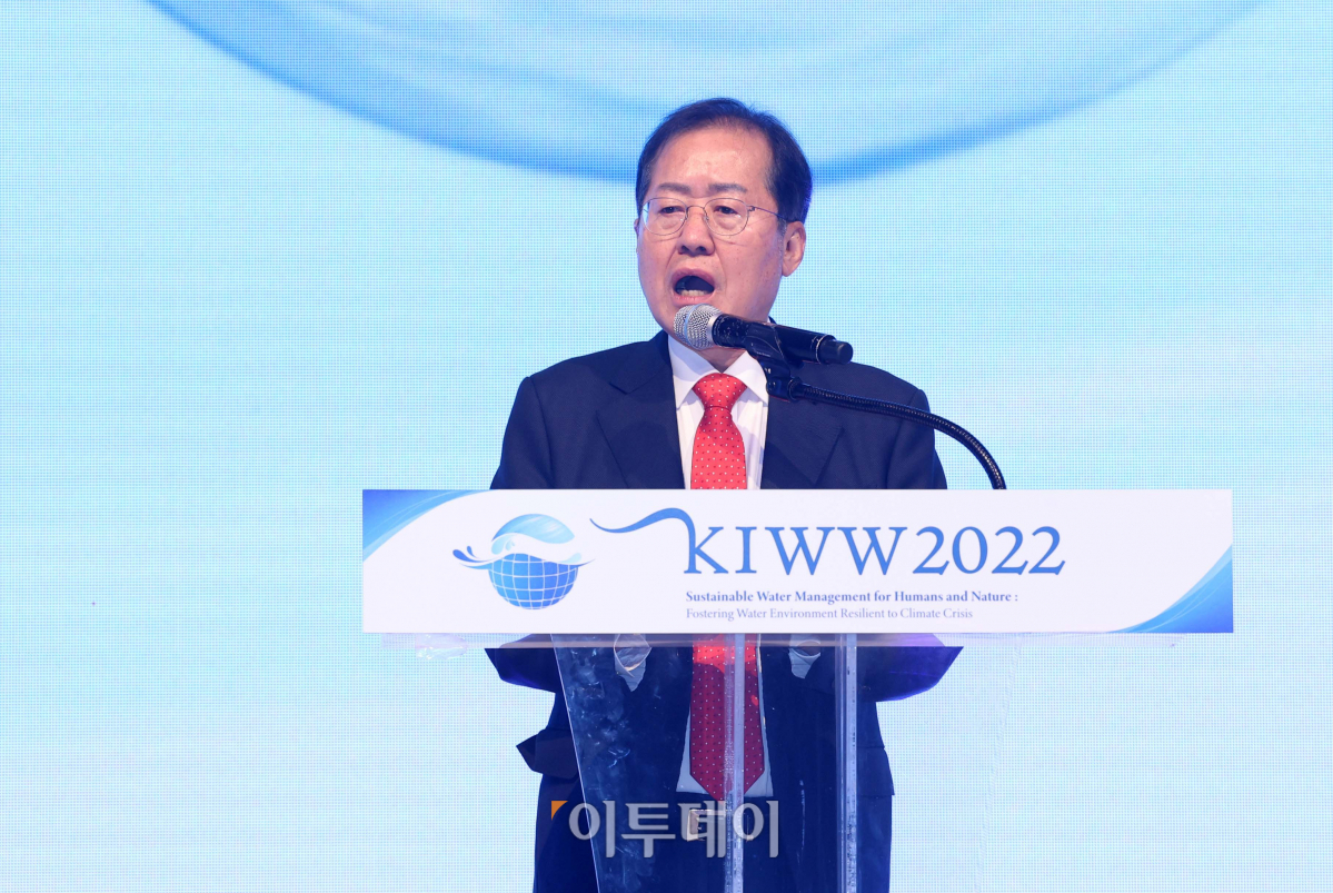 홍준표 대구시장이 23일 대구 북구 엑스코에서 열린 ‘대한민국 국제물주간 2022’ 개회식에서 인사말을 하고 있다. 국제물주간은 우리나라의 물 분야에 대한 위상을 높이고 물산업의 해외 진출을 지원하기 위해 2016년 시작된 국내 최대 규모 물 분야 전시회·포럼으로, 코로나19로 3년 만에 다시 개최됐다.