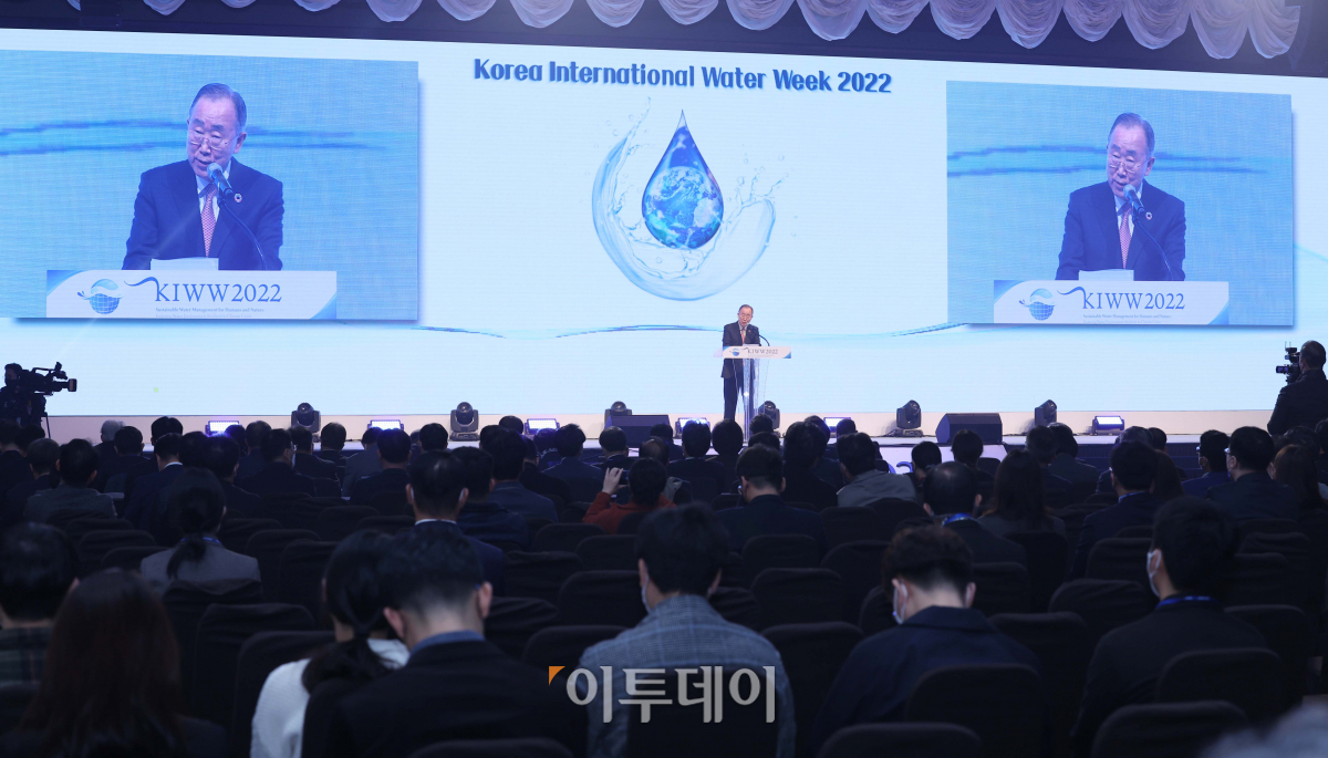 반기문 전 유엔(UN) 사무총장이 23일 대구 북구 엑스코에서 열린 ‘대한민국 국제물주간 2022’에서 기조연설을 하고 있다. 국제물주간은 우리나라의 물 분야에 대한 위상을 높이고 물산업의 해외 진출을 지원하기 위해 2016년 시작된 국내 최대 규모 물 분야 전시회·포럼으로, 코로나19로 3년 만에 다시 개최됐다.