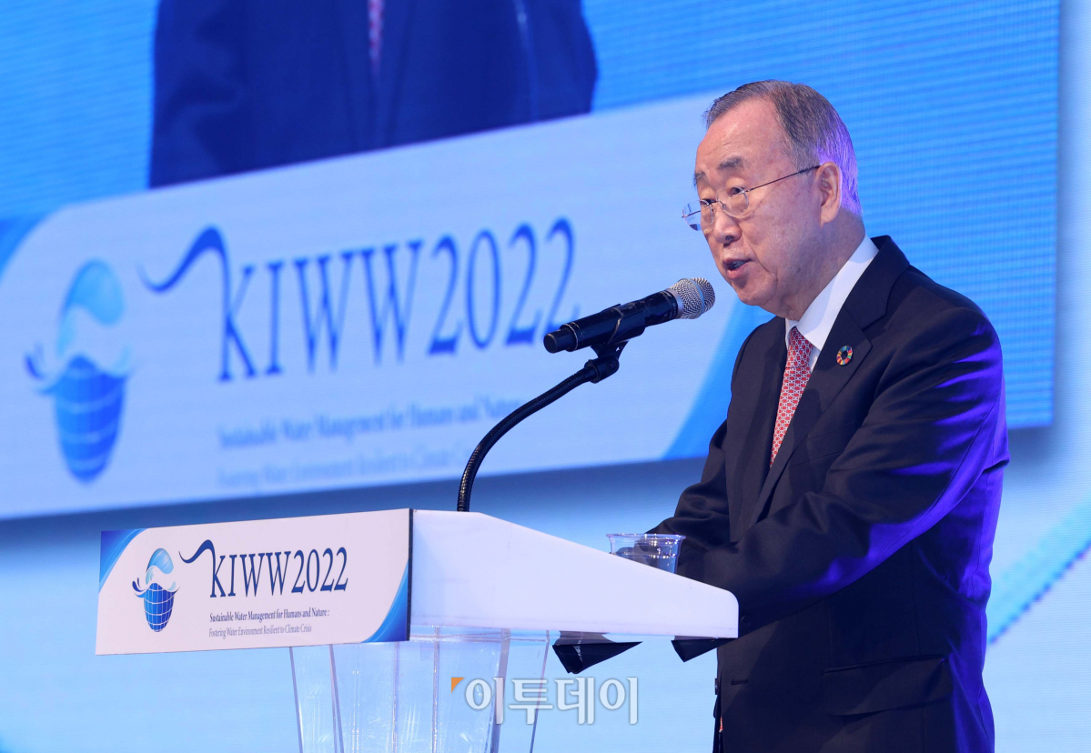 반기문 전 유엔(UN) 사무총장이 23일 대구 북구 엑스코에서 열린 ‘대한민국 국제물주간 2022’에서 기조연설을 하고 있다. 국제물주간은 우리나라의 물 분야에 대한 위상을 높이고 물산업의 해외 진출을 지원하기 위해 2016년 시작된 국내 최대 규모 물 분야 전시회·포럼으로, 코로나19로 3년 만에 다시 개최됐다.
