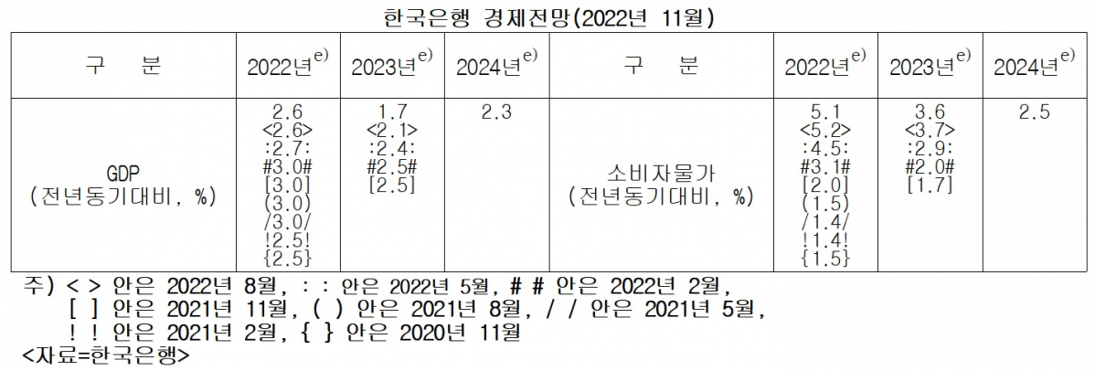 한국은행은 24일 수정경제전망을 통해 내년 경제성장률(GDP)과 소비자물가(CPI) 전망치를 각각 1.7%와 3.6%로 예상했다. 이는 8월 예측치(각각 2.1%, 3.7%) 대비 각각 0.4%포인트와 0.1%포인트 낮춰 잡은 것이다.
