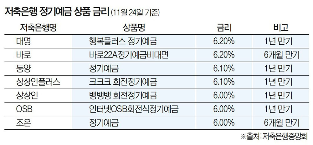 이 밖에도 동양저축은행 '정기예금', 상상인플러스저축은행의 '크크크 회전정기예금'이 연 6.10%(12개월 만기), 상상인저축은행의 '뱅뱅뱅 회전정기예금'과 OSB저축은행의 '인터넷OSB회전식정기예금'(12개월 만기)이 연 6.00%의 금리를 책정했다.