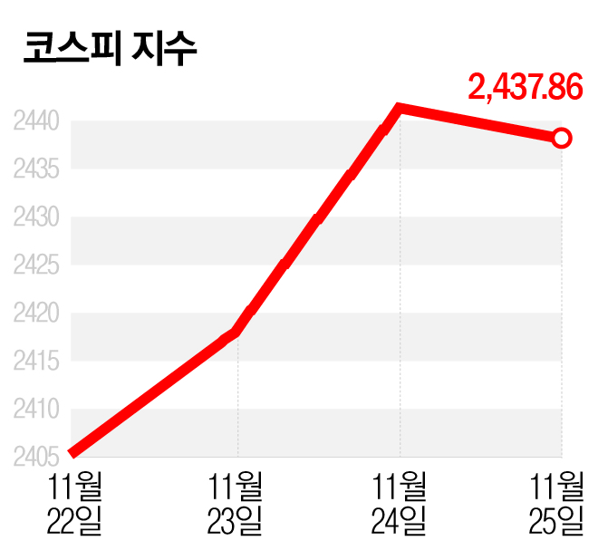27일 한국거래소에 따르면 이번 주 코스피 지수는 전주 종가(18일·2444.48)보다 6.62포인트(0.27%) 하락한 2437.86에 마감했다.