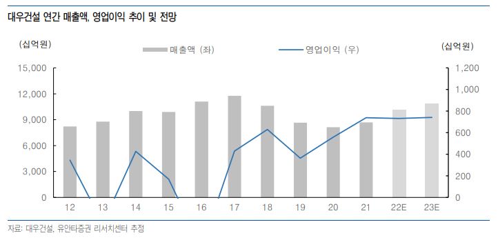 유안타증권이 대우건설에 대해 거점 국가 위주의 해외 수주가 확대되면서 국내 주택 의존도를 낮춰갈 전망이라고 봤다. 투자의견은 ‘매수’, 목표주가는 6400원을 유지했다.