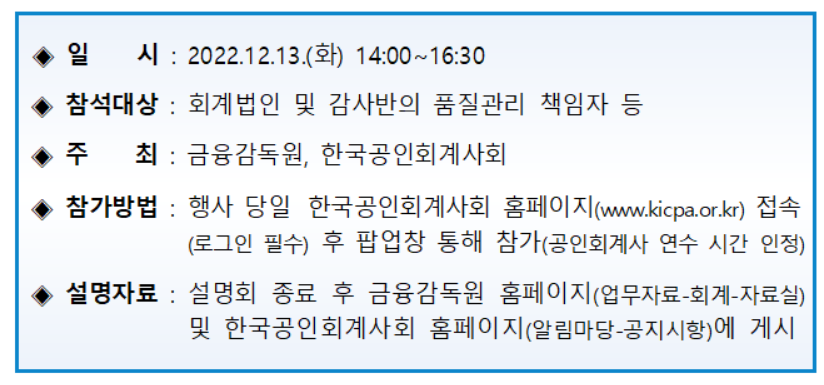 금융감독원이 다음 달 13일 한국공인회계사회와 ‘2022년도 온라인 회개현안설명회’를 개최한다.