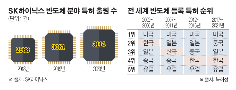 1일 본지 취재 결과 SK하이닉스의 반도체 분야 특허 출원 수는 2018년 2968건, 2019년 3061건, 2020년 3114건으로 매년 확대되고 있다. 삼성전자는 따로 특허 출원 수를 공개하지 않았으나, 매년 증가하고 있는 것으로 알려졌다.