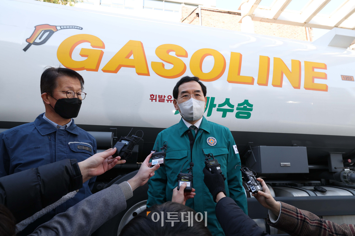 이창양 산업통상자원부 장관이 30일 서울의 한 휘발유 품절 주유소를 찾아 관계자로부터 주유소 운영현황과 화물연대 집단 운송거부로 인한 석유제품 유통 차질 등 애로사항을 청취한 뒤 취재진의 질문에 답하고 있다.