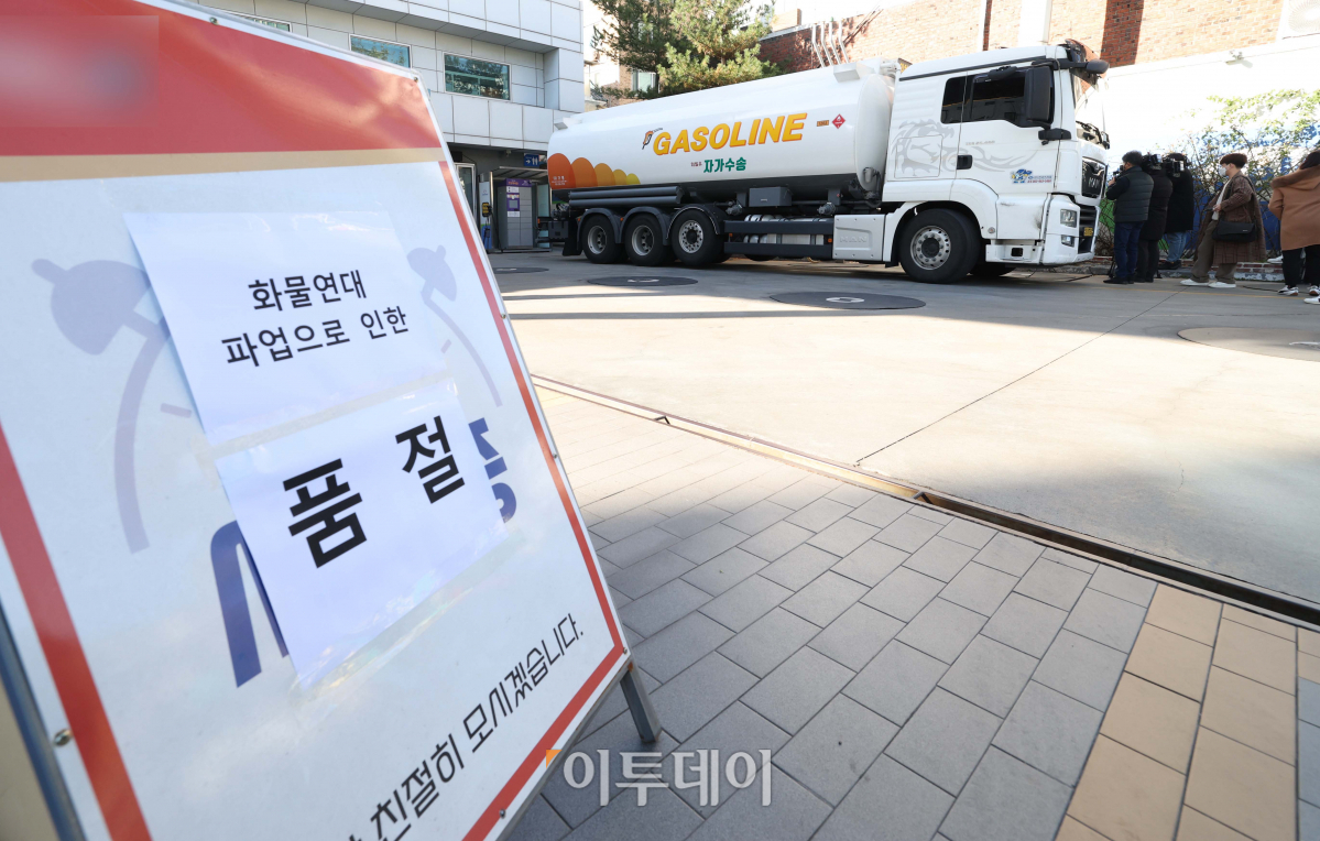 화물연대의 집단 운송거부로 휘발유 공급에 비상이 걸린 가운데 30일 서울의 한 주유소에서 긴급공수된 유조차가 휘발유를 급유하고 있다.