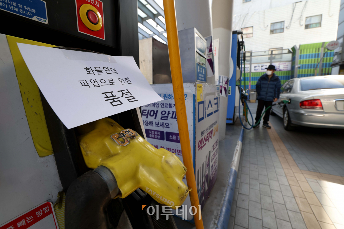 화물연대의 집단 운송거부로 휘발유 공급에 비상이 걸린 가운데 30일 서울의 한 주유소에 휘발유 품절 안내문이 게시돼 있다.