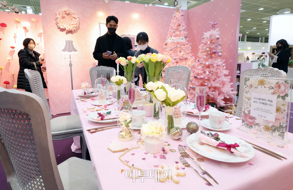 1일 서울 강남구 코엑스에서 열린 ‘2022 홈·테이블데코페어’ 행사장에 핑크빛 크리스마스 소품들이 전시돼 있다. 홈·테이블데코페어는 최신 인테리어 트렌드와 감각적인 리빙 브랜드를 한 곳에서 소개하는 홈스타일링 전시회다.