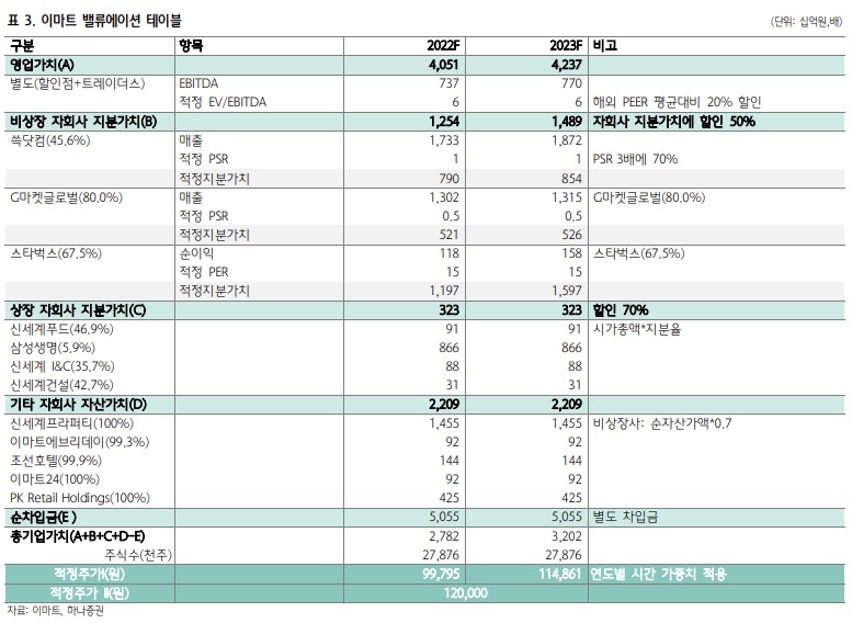 결국 오프라인 할인점 매출이 올라와야 하는데 외부환경이 비우호적이기 때문이다. 그는 "코로나19 기간만큼의 식료품 구매 수요를 기대하기 어렵고, 높은 인플레이션이 지속한다면 수요 위축 가능성도 존재한다. 수익성 측면에서도 할인점은 PP센터 수수료 부담으로 이익 개선 폭이 제한적이다"라고 했다.