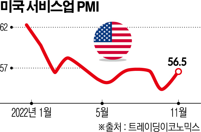 실제로 이날 발표된 11월 미국 공급관리협회(ISM) 비제조업(서비스업) 구매관리자지수(PMI)는 56.5를 기록했다. 이는 전월(54.4) 대비 둔화한 53.3으로 하락할 것이라는 시장 예상을 벗어난 것이다. 2일 발표된 지난달 비농업 신규 고용도 26만3000건 증가해 시장 전망 20만 건을 웃돌았다. 특히 시간당 평균 임금은 전망치의 두 배에 달하는 0.6%(전월 대비)의 인상폭을 기록했다.