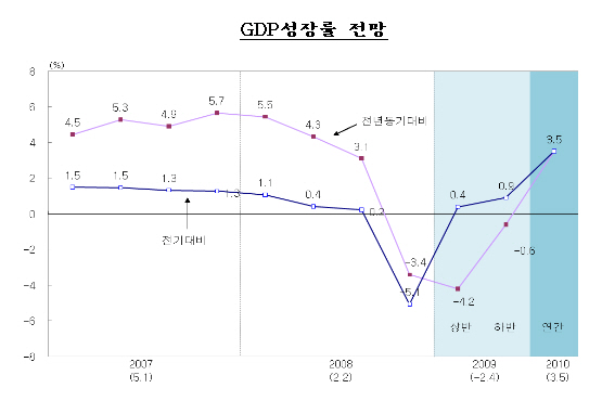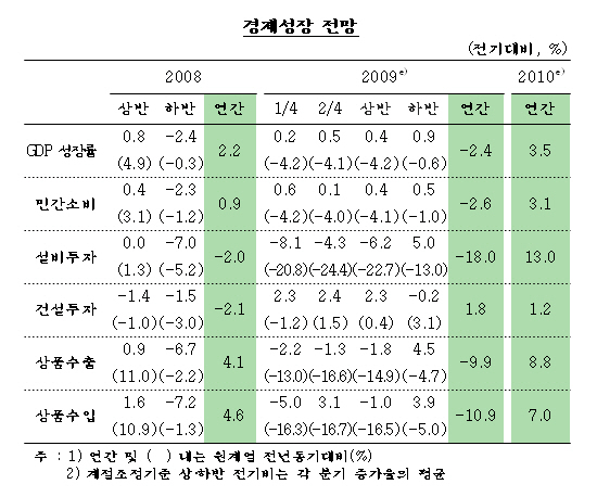 10일 한국은행은 '2009년 경제전망' 수정안을 발표, 올해 국내 총생산(GDP) 성장률은 내외수요 부진으로 전년대비 - 2.4%를 기록할 것이라며 올 상반기에만 -4.2%의 '역성장'이 불가피해 보인다고 전망했다.