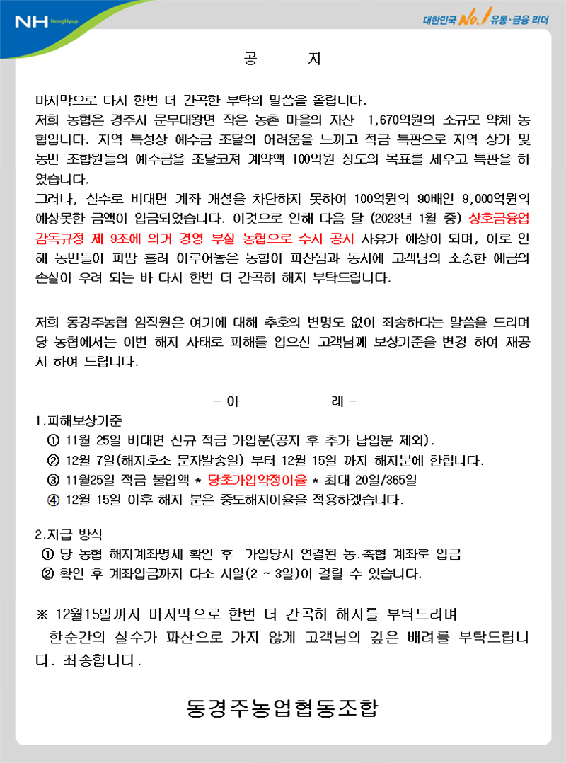 동경주농협은 추가 공지를 통해 "다음 달 경영 부실 농협으로 수시 공시 사유가 예상되고 이로 인해 파산되면 고객의 예금 손실이 우려되는 만큼 간곡히 해지를 부탁드린다"고 밝혔다.