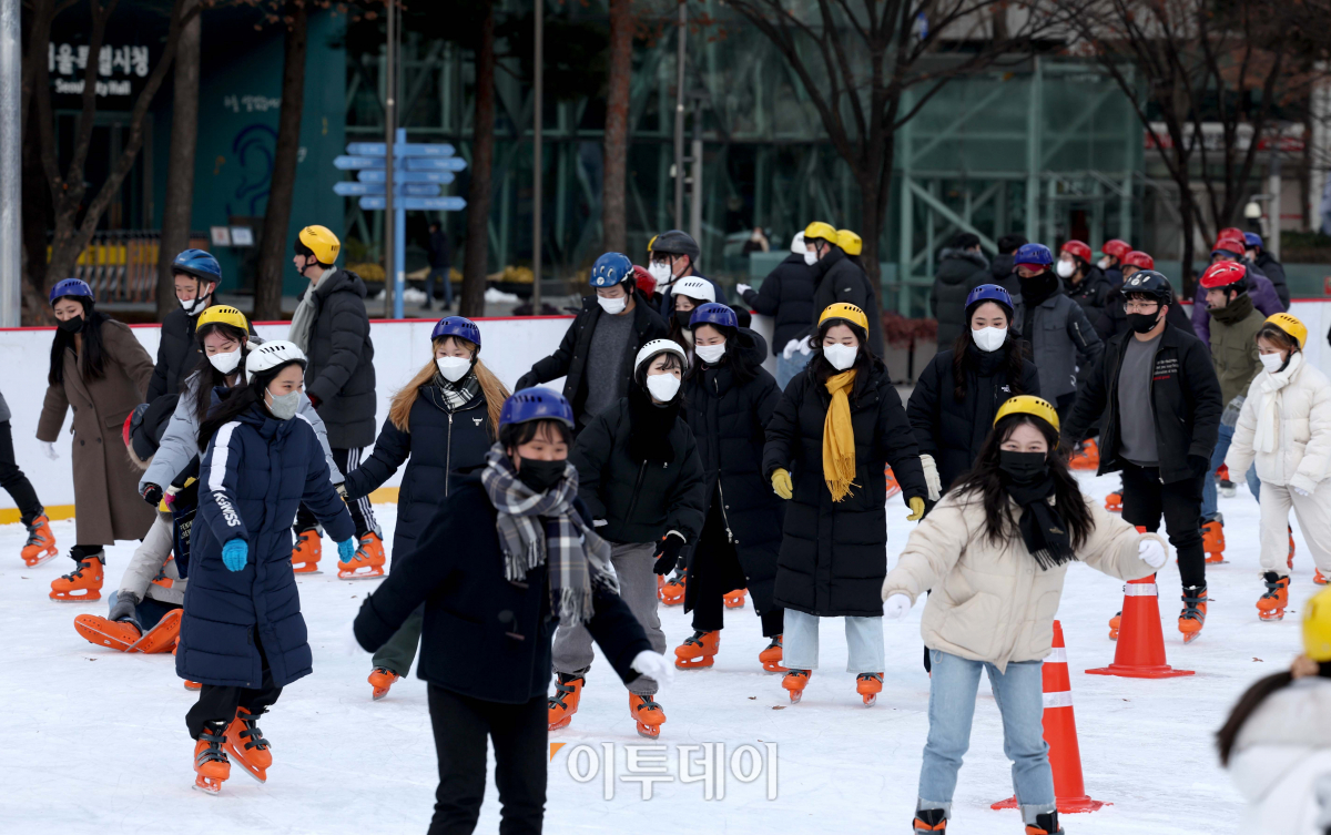 22일 서울광장 스케이트장에서 시민들이 얼음을 지치며 겨울의 정취를 만끽하고 있다. 코로나19 사태로 중단됐던 서울광장 스케이트장이 3년 만에 문을 열었다. 기간은 내년 2월 12일까지로 평일은 오전 10시부터 오후 9시 30분까지, 주말과 공휴일은 오전 10시부터 밤 11시까지 운영한다. 이용료는 1시간 1000원으로 스케이트와 헬멧 및 무릎보호대 등 안전용품도 무료로 빌릴 수 있다.