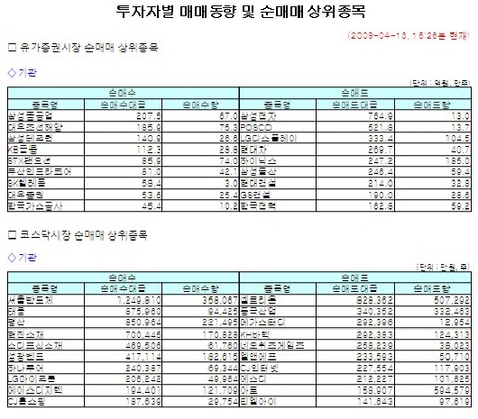한국투자증권 법인영업팀 최영호 차장은“오늘 기관들의 매도가 더 강화되었지만 상승 추세가 쉽게 꺽이진 않을 것이다.”며“다만 이번 주에 발표되는 미국 금융주들의 실적과 GM의 파산 여부가 중요해 보인다.”고 말했다.