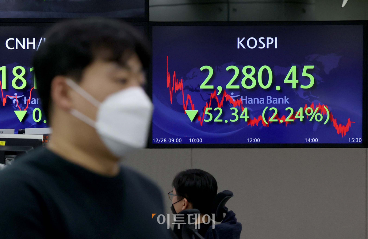 코스피가 배당락과 미국 나스닥지수 하락 영향을 받아 2% 넘게 급락하며 두 달여 만에 2300선 밑으로 떨어졌다. 28일 서울 중구 하나은행 딜링룸 전광판에 코스피가 전 거래일보다 52.34포인트(2.24%)내린 2280.45를 가리키고 있다.