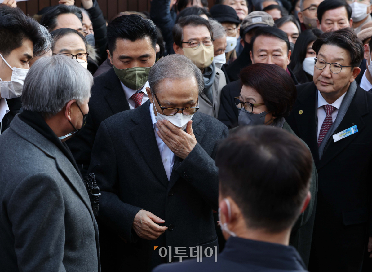 신년 특별사면으로 사면·복권된 이명박 전 대통령이 30일 서울 강남구 논현동 자택에 도착, 대국민 메시지 발표에 앞서 마스크를 만지고 있다.