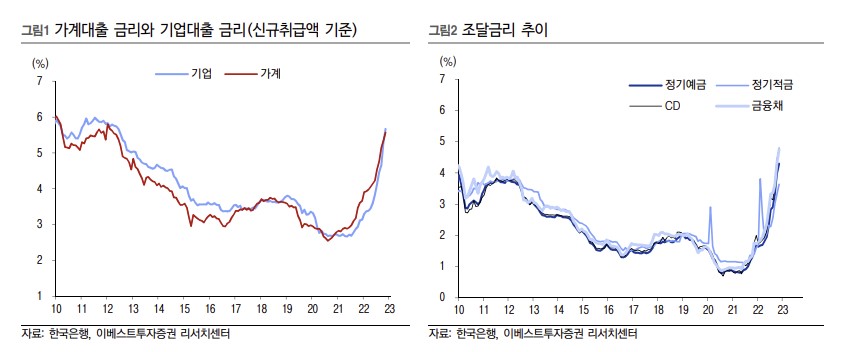 전 연구원은 “12월말 시장금리(국고채 3년)는 고점 대비 90bp가량 하락한 상태”라며 “2023년에도 금리인상 기조가 이어질 것이나 추가인상 여지가 크지 않아 은행주의 금리모멘텀은 점차 약화될 수 밖에 없다고 판단되고 높아진 조달비용 관리 중요도가 더욱 부각될 전망”이라고 내다봤다.
