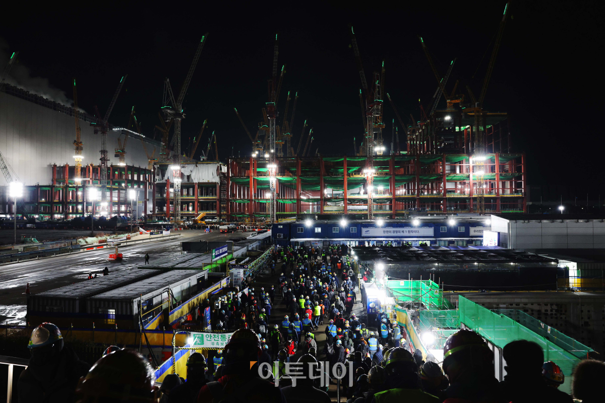 기획재정부, 한국은행 등 주요 기관에 따르면 올해 경제 성장률은 수출 감소와 고금리, 소비 위축 등 잇단 악재에 잠재성장률을 밑도는 1%대에 그칠 것으로 전망된다. 그럼에도 우리에겐 경제 성장의 버팀목이 있다. 삼성전자, SK하이닉스 등 국내 대표 반도체 기업들은 글로벌 반도체 시장의 침체 속에서도 초격차 경쟁력을 이어가고 있다. 세계 최대 규모의 반도체 생산시설인 삼성전자 평택캠퍼스는 미래 반도체 시장의 주도권을 확보하는 데 중추 역할을 할 것으로 기대된다. 경기 삼성전자 평택캠퍼스 공사 현장으로 협력업체 직원들이 출근하고 있다.