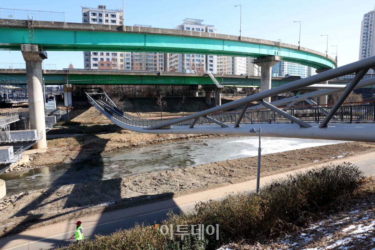 3일 서울 구로구 도림보도육교가 주저앉아 있다. 영등포구와 경찰 등에 따르면 이날 오전 1시40분께 영등포구 도림동과 신도림역을 잇는 도림보도육교가 내려앉아 육교와 하부 자전거도로·산책로가 전면 통제됐다. 현장 조사 결과 육교를 지탱하던 지지대 시멘트와 난간 철제가 일부 파손됐으나 인명 피해는 발생하지 않은 것으로 파악됐다.