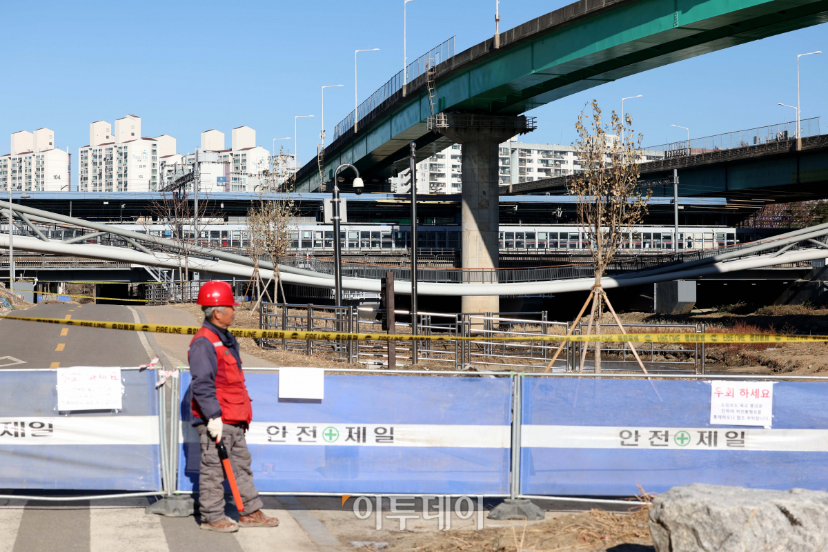 3일 서울 구로구 도림보도육교가 주저앉아 있다. 영등포구와 경찰 등에 따르면 이날 오전 1시40분께 영등포구 도림동과 신도림역을 잇는 도림보도육교가 내려앉아 육교와 하부 자전거도로·산책로가 전면 통제됐다. 현장 조사 결과 육교를 지탱하던 지지대 시멘트와 난간 철제가 일부 파손됐으나 인명 피해는 발생하지 않은 것으로 파악됐다.