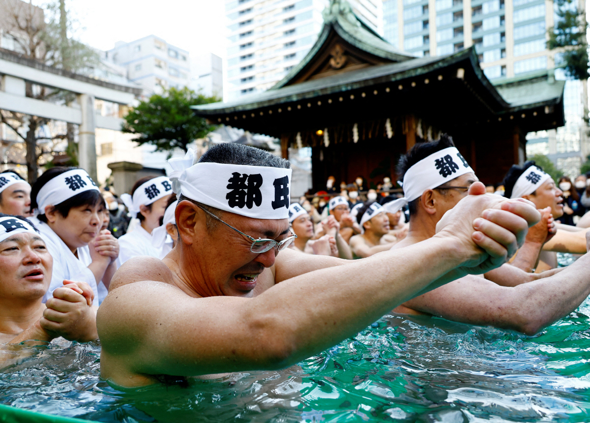 일본 도쿄의 텟포즈이나리신사에서 8일 새해 안녕을 기원하는 전통의식인 ‘얼음물 목욕’ 행사가 열린 가운데 참가자들이 두 손을 굳게 잡고 추위를 참고 있다. 매년 새해 두 번째 일요일 열리는 이 행사는 올해로 68년째를 맞았다. 도쿄/로이터연합뉴스