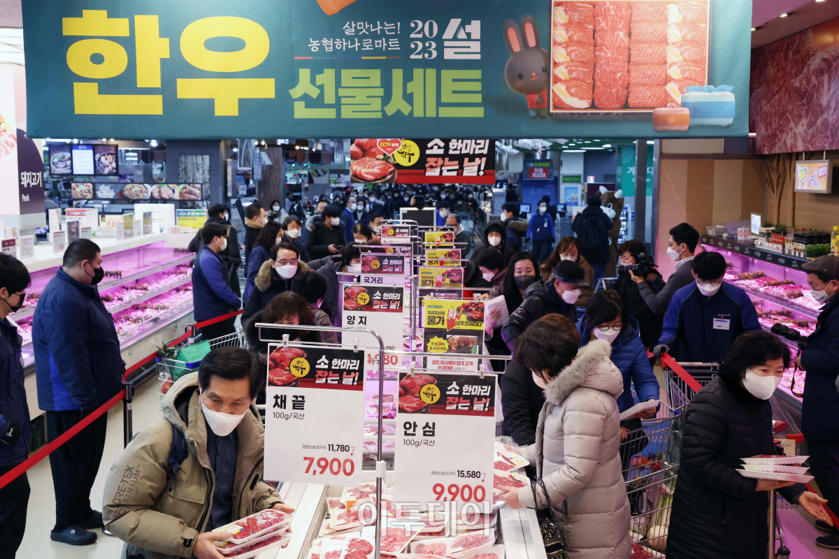 9일 서울 서초구 하나로마트 양재점에서 열린 ‘한우 100마리 파격 할인 행사’에서 시민들이 한우를 구입하고 있다. 농협유통은 한우 출하량 증가와 소비감소로 어려움을 겪고 있는 축산농가를 돕기 위해 하나로마트 양재·창동·고양·성남·수원점 등 18개 매장에서 11일까지 등심·국거리·불고기·채끝·양지 등 대표품목 한우 100마리분을 시중가 대비 최대 32.7% 할인된 가격으로 판매한다.