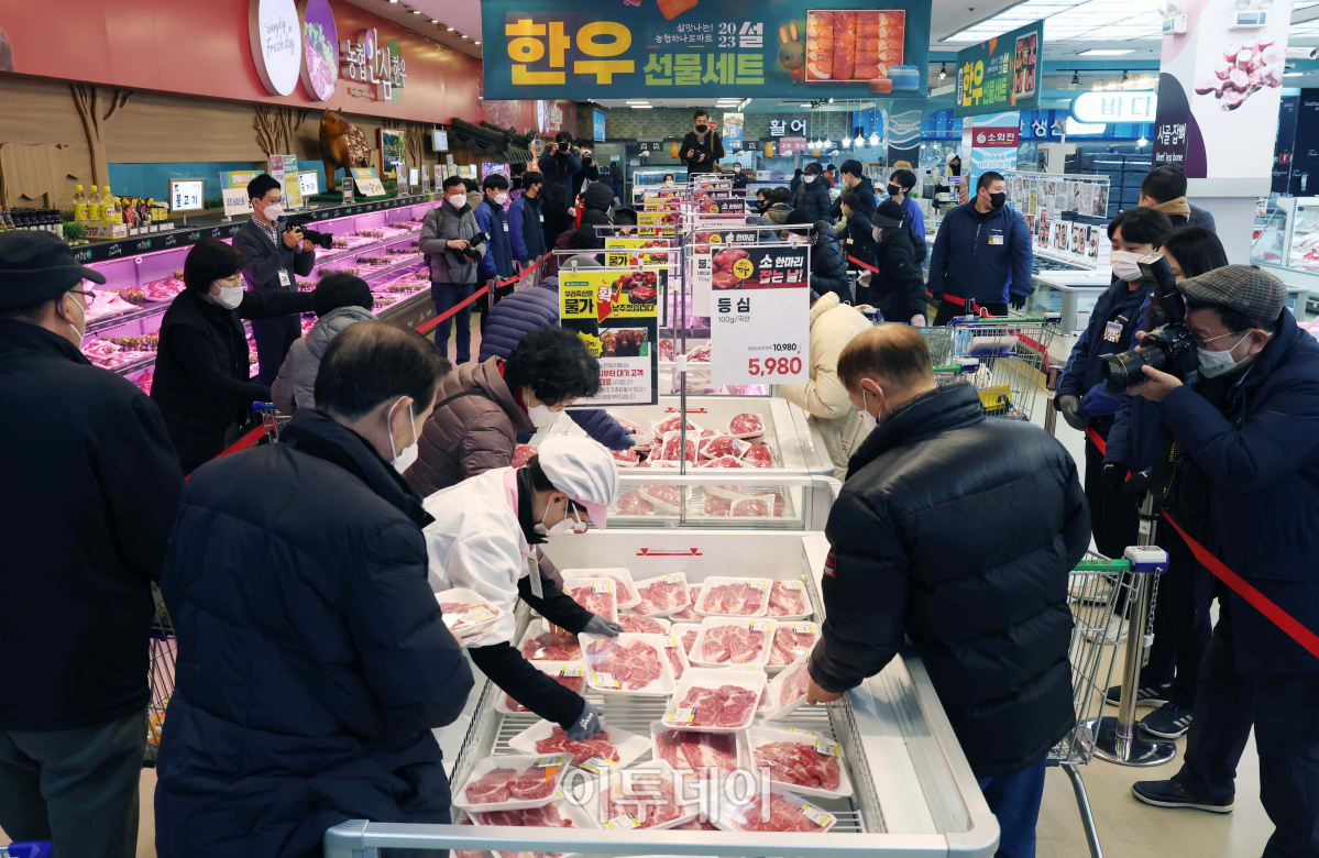 9일 서울 서초구 하나로마트 양재점에서 열린 ‘한우 100마리 파격 할인 행사’에서 시민들이 한우를 구입하고 있다. 농협유통은 한우 출하량 증가와 소비감소로 어려움을 겪고 있는 축산농가를 돕기 위해 하나로마트 양재·창동·고양·성남·수원점 등 18개 매장에서 11일까지 등심·국거리·불고기·채끝·양지 등 대표품목 한우 100마리분을 시중가 대비 최대 32.7% 할인된 가격으로 판매한다.