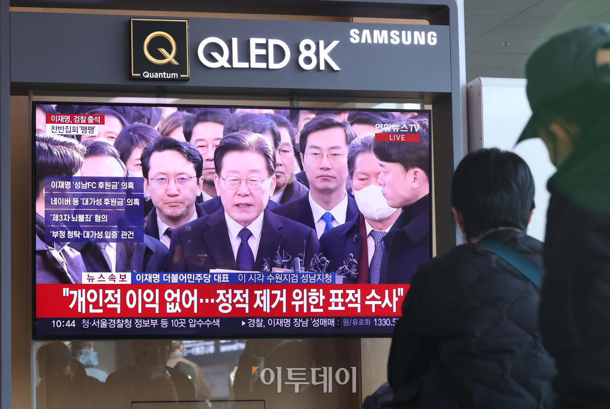 이재명 더불어민주당 대표가 10일 '성남FC 후원금 의혹' 사건 관련 조사를 받기 위해 경기 성남시 수원지방검찰청 성남지청으로 출석한 가운데 이날 서울역에서 시민들이 이 대표의 출석을 TV 생중계로 시청하고 있다.