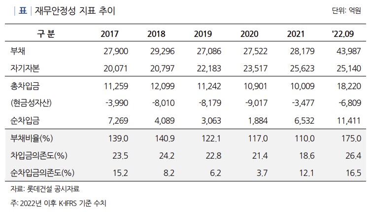 롯데건설은 작년 하반기 차환 이슈가 발생한 이후 그룹 계열로부터 약 1조1000억 원 규모의 유상증자 및 차입지원을 받고, 금융권으로부터 1조4000억 원을 차입 등을 통해 총 2조5000억 원의 현금 유동성을 확보했다.
