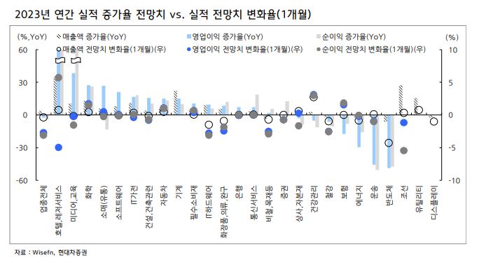 현대차증권은 올해 국내시장의 경우 실적 감소와 이익 전망치의 가파른 하향, ROE의 추세적 하락 등으로 주요국 대비 투자 매력도가 낮다고 봤다. 이에 매출과 마진이 증가하면서도 동시에 실적 전망치가 상향 조정되고 있는 업종을 골라야 한다고 조언한다.