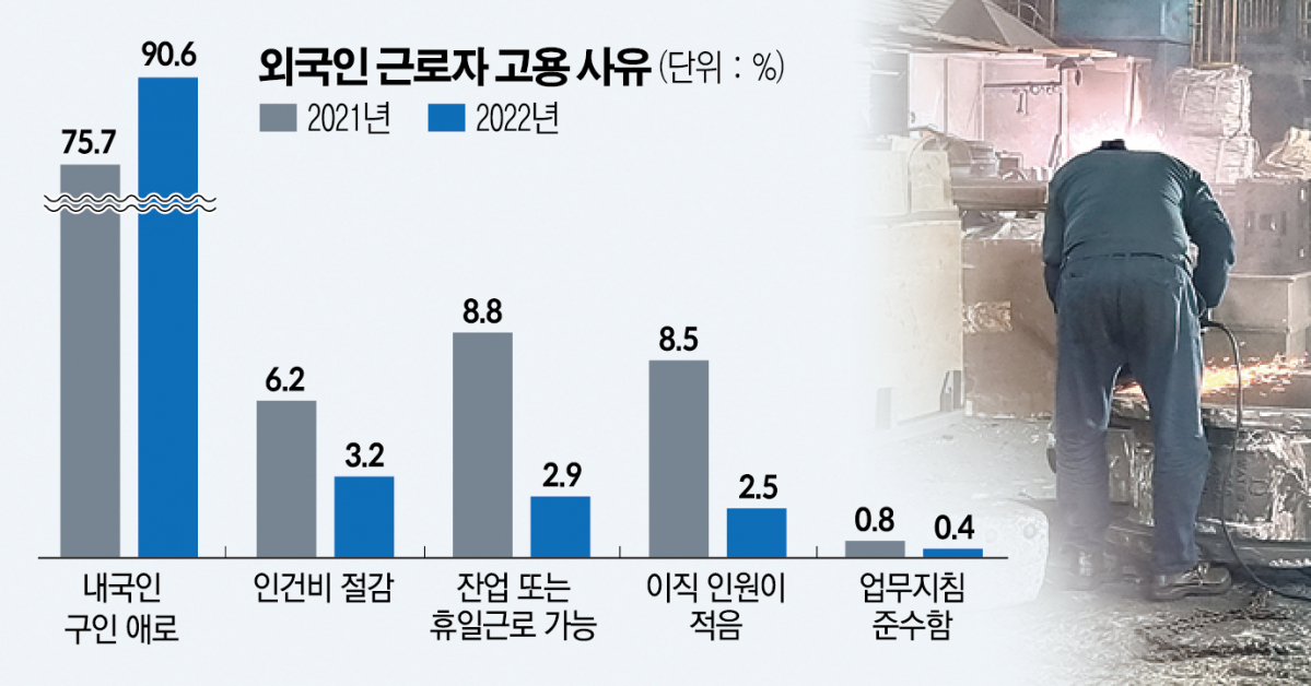 18일 중소기업중앙회가 발표한 ‘외국인력 고용 관련 종합애로 실태조사’에 따르면 중소기업들은 외국인 근로자를 고용하는 가장 큰 이유로 ‘내국인 구인 애로’(90.6%)를 꼽았다. 이는 2020년(74.2%)과 2021년(75.7%) 대비 약 15.0%포인트(p) 이상 증가한 수치다. 내국인 취업 기피, 주 52시간 근무제 시행 및 인구절벽에 따른 생산가능인구 감소로 인해 외국인 근로자 고용 필요성이 급격히 늘어난 것으로 풀이된다.