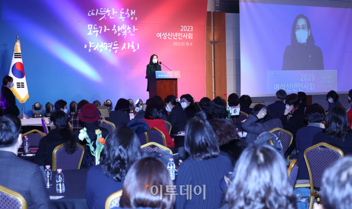 김현숙 여성가족부 장관이 18일 서울 용산구 백범김구기념관에서 열린 ‘2023 여성신년인사회’에서 환영사를 하고 있다.