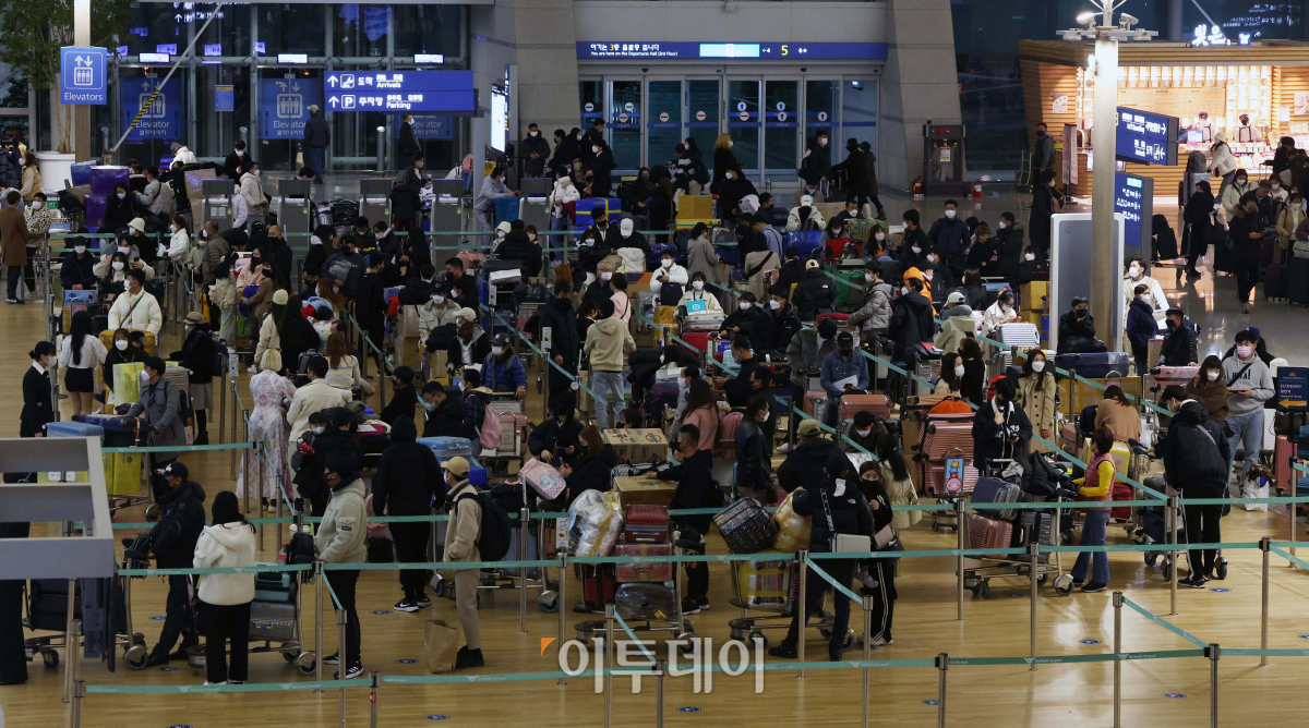 19일 인천 중구 인천국제공항 제1여객터미널이 설 연휴를 앞두고 해외여행을 떠나려는 시민들로 붐비고 있다. 인천국제공항공사는 설 연휴인 오는 20~24일 5일간 인천공항 이용객이 61만6074명으로 예측됐다고 밝혔다. 하루 평균 12만3215명 수준이다. 지난해 설 연휴 이용객 5만3153명(하루 평균 8859명)과 비교하면 1290%가 늘어난 규모다.