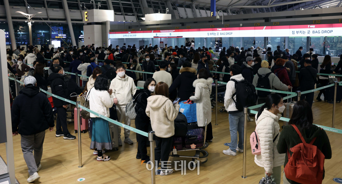 19일 인천 중구 인천국제공항 제1여객터미널이 설 연휴를 앞두고 해외여행을 떠나려는 시민들로 붐비고 있다. 인천국제공항공사는 설 연휴인 오는 20~24일 5일간 인천공항 이용객이 61만6074명으로 예측됐다고 밝혔다. 하루 평균 12만3215명 수준이다. 지난해 설 연휴 이용객 5만3153명(하루 평균 8859명)과 비교하면 1290%가 늘어난 규모다.