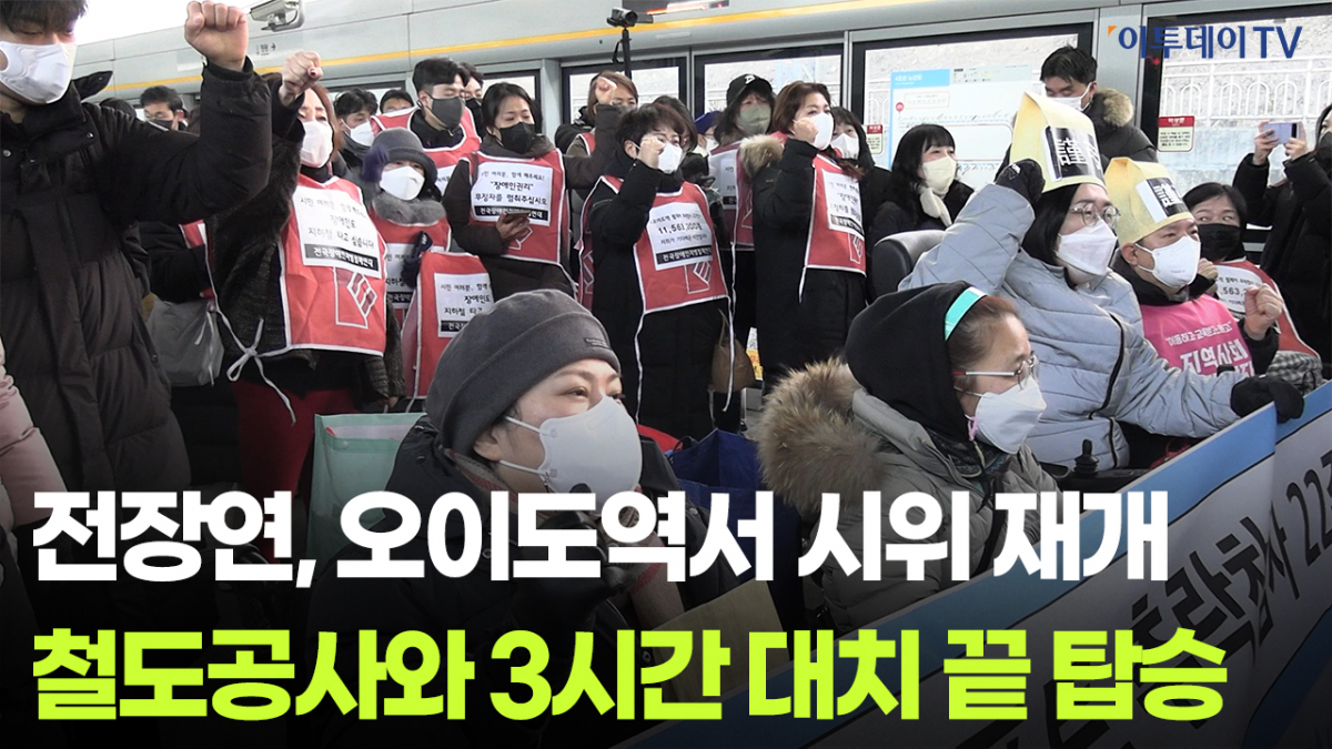 이들은 기자회견 후 오이도역에서 서울역으로 향하는 열차에 탑승을 시도했지만 한국철도공사와 경찰 등에 가로막혀 3시간가량 대치했습니다. 철도 공사는 전장연 회원들에게 “전철 내에서 소란행위를 하지 않겠다”는 약속받고, 11시 20분께 탑승을 허용했습니다.