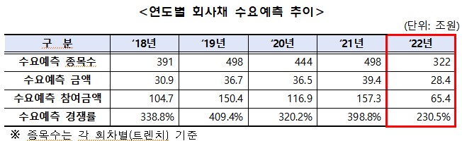 25일 금융투자협회가 발표한 '2022년 공모회사채 수요예측 실시 현황'에 따르면 지난해 진행된 공모 무보증사채 수요예측은 총 332건, 28조4000억 원으로 지난해 같은 기간보다 각각 35.3%(156건), 28.0%(17조3000억 원) 감소했다. 지난해 수요예측 경쟁률도 230.5%를 기록해 지난해(398.8%) 대비 약 170% 급락했다.