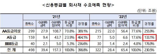 지난해 회사채 시장이 얼어붙은 것으로 나타났다. 한국은행의 사상 첫 7회 연속 금리 인상에 평가 손실을 우려한 기관투자자들의 투자심리가 위축되면서다. 특히 우량(AAA) 등급과 비우량(BBB) 등급 경계에 서 있는 A등급 회사채 수요예측 금액은 전년 대비 반 토막, 경쟁률은 반의 반토막이 났다.
