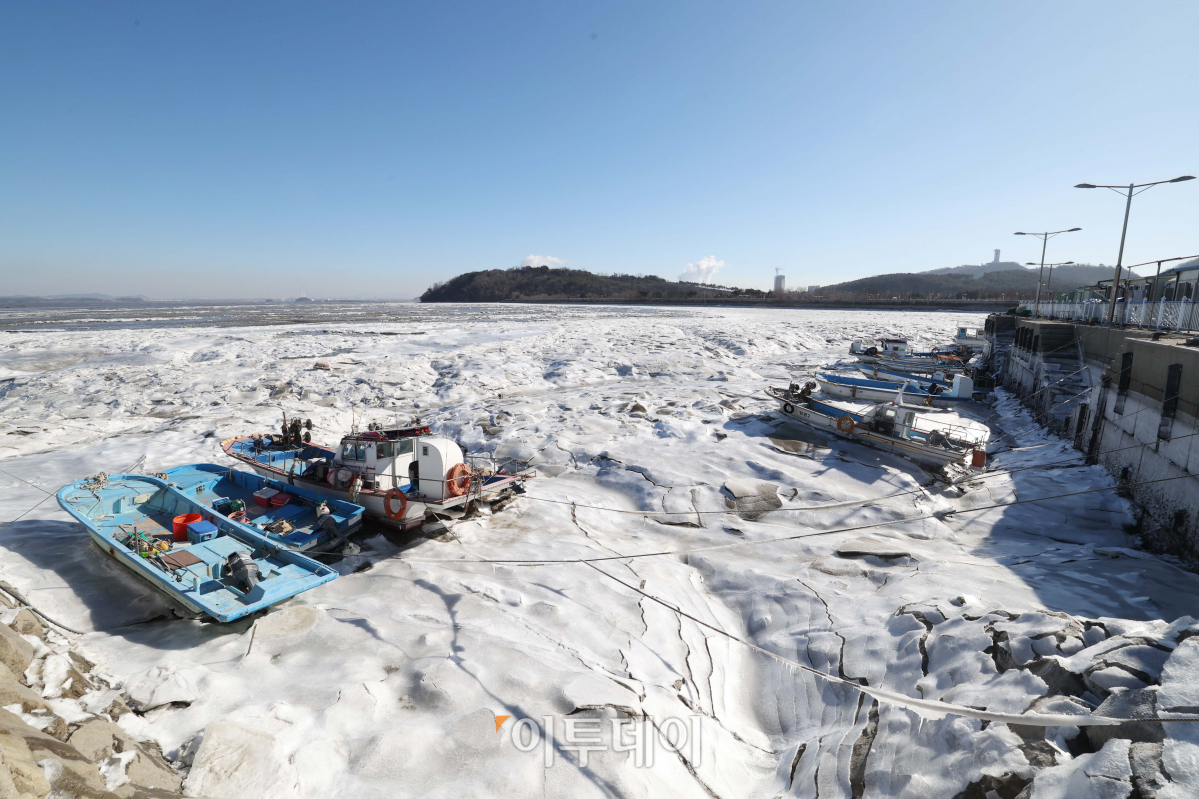 서울 아침 최저기온이 영하 18도를 기록하는 등 전국에 한파특보가 내려진 25일 인천 중구 예단포선착장 앞바다가 얼어붙어 있다.