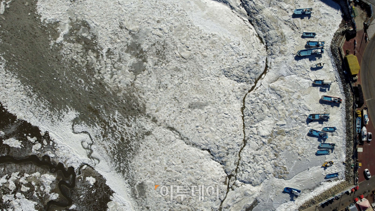 서울 아침 최저기온이 영하 18도를 기록하는 등 전국에 한파특보가 내려진 25일 인천 중구 예단포선착장 앞바다가 얼어붙어 있다.