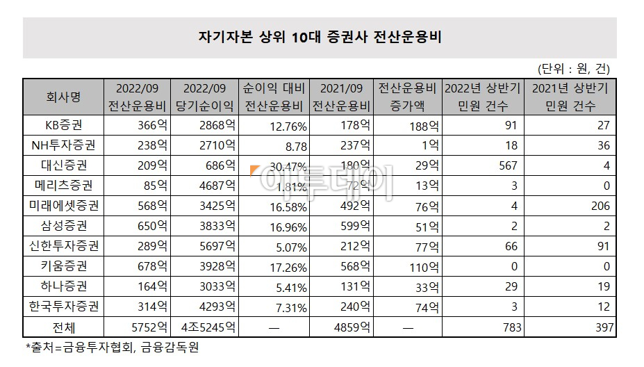 29일 금융투자업계에 따르면 자기자본 상위 10대 증권사(KB·NH·대신·미래에셋·메리츠·삼성·신한·하나·키움·한국투자증권)의 지난해 3분기 전산운용비는 전년 동기(4859억 원) 대비 17.82% 증가한 5752억 원으로 집계됐다. 이 기간 당기순이익(4조5245억 원)의 12.71%에 달하는 금액이다.