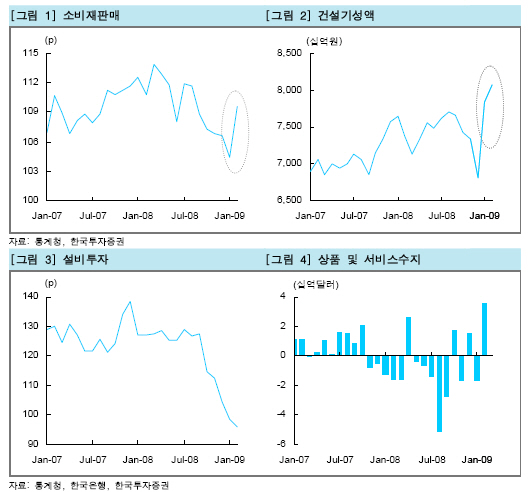한국투자증권은 작년 말 이후 정부의 적극적인 경기 부양책 및 금융시장 안정화 노력 덕분에 2월 지표가 호전된 것으로 나타났기 때문에 1분기 국내 경기의 추가 하락은 제한될 것이라고 전망했다.
