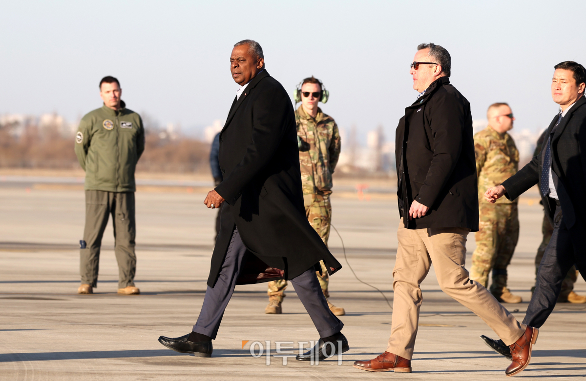 로이드 오스틴 미국 국방장관이 30일 오후 경기 오산 공군기지를 통해 입국하고 있다. 사진공동취재단