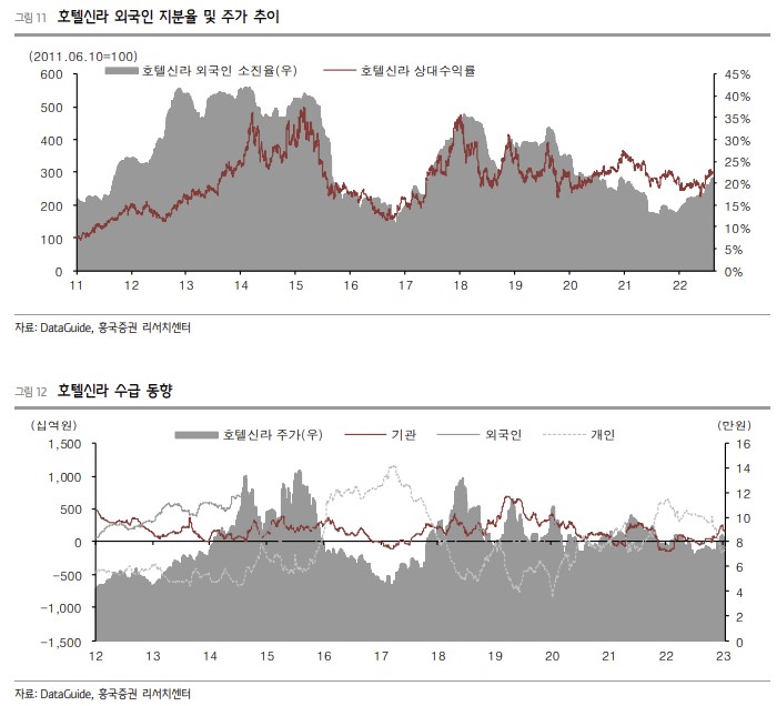올해 1분기까지는 부진한 실적 추세 지속이 불가피할 것으로 봤다. 그는 "1분기 연결기준 매출액 1조5000억 원(+36.2% YoY), 영업이익 132억 원(-12.3% YoY)으로 부진한 실적 모멘텀 불가피할 전망"이라며 "호텔&레저 부문 호조에도 불구하고, 면세점의 영업이익 둔화 때문이다. 면세사업에 대한 구조개선 작업이 진행되고 있다"고 말했다.
