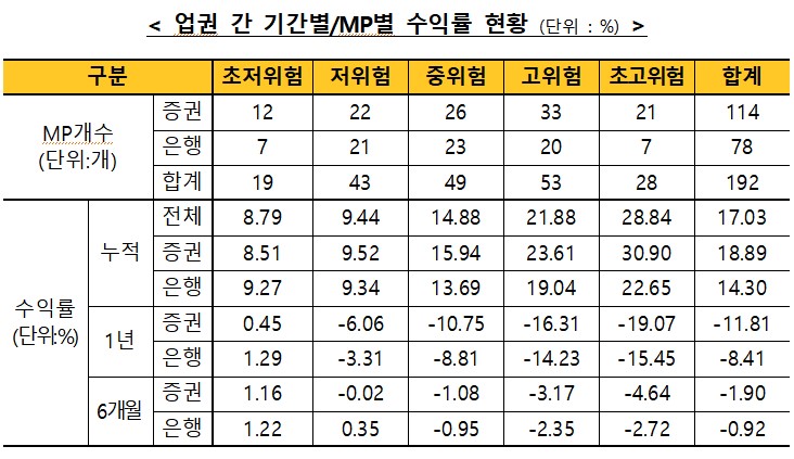 개별 MP 중에는 키움증권 기본투자형(초고위험)이 누적수익률 83.65%로 전체 수익률 1위를 기록했다.